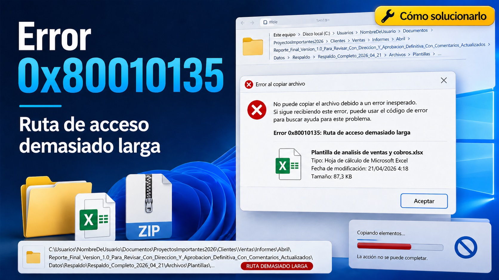 El error 0x80010135 puede parecer más grave de lo que realmente es. En la mayoría de situaciones, no significa que el archivo esté dañado, sino que Windows se está encontrando con una ruta demasiado larga para completar la acción.