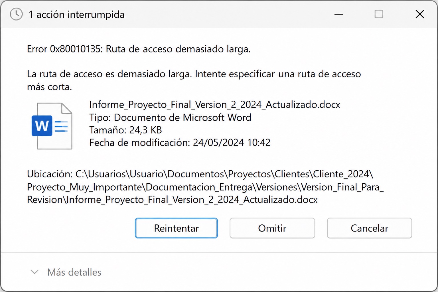 En nuestro caso, el fallo apareció al trabajar con un archivo dentro de una estructura de carpetas demasiado larga. Al principio parecía que el problema estaba en el propio documento, porque el error salía justo al intentar moverlo o trabajar con él. Sin embargo, al revisar el mensaje completo vimos la clave: ruta de acceso demasiado larga.