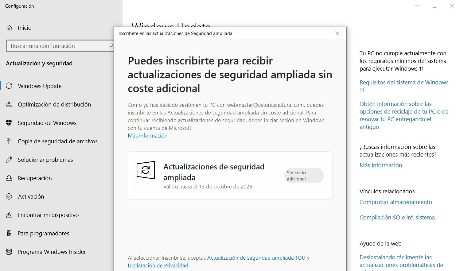 Si ambas condiciones se cumplen, la inscripción se completará automáticamente y el PC seguirá recibiendo los parches de seguridad hasta 2026.